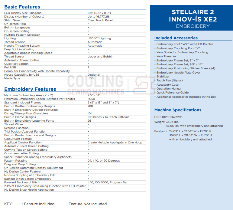 - Wireless Enabled- The Stellaire2 Innov-ís XE2 is wireless enabled so you can receive software update notifications as well as send embroidery files from your PC to your machine via the free downloadable software Design Database Transfer‡ (no USB required). This allows for easy data management for all your designs and projects.